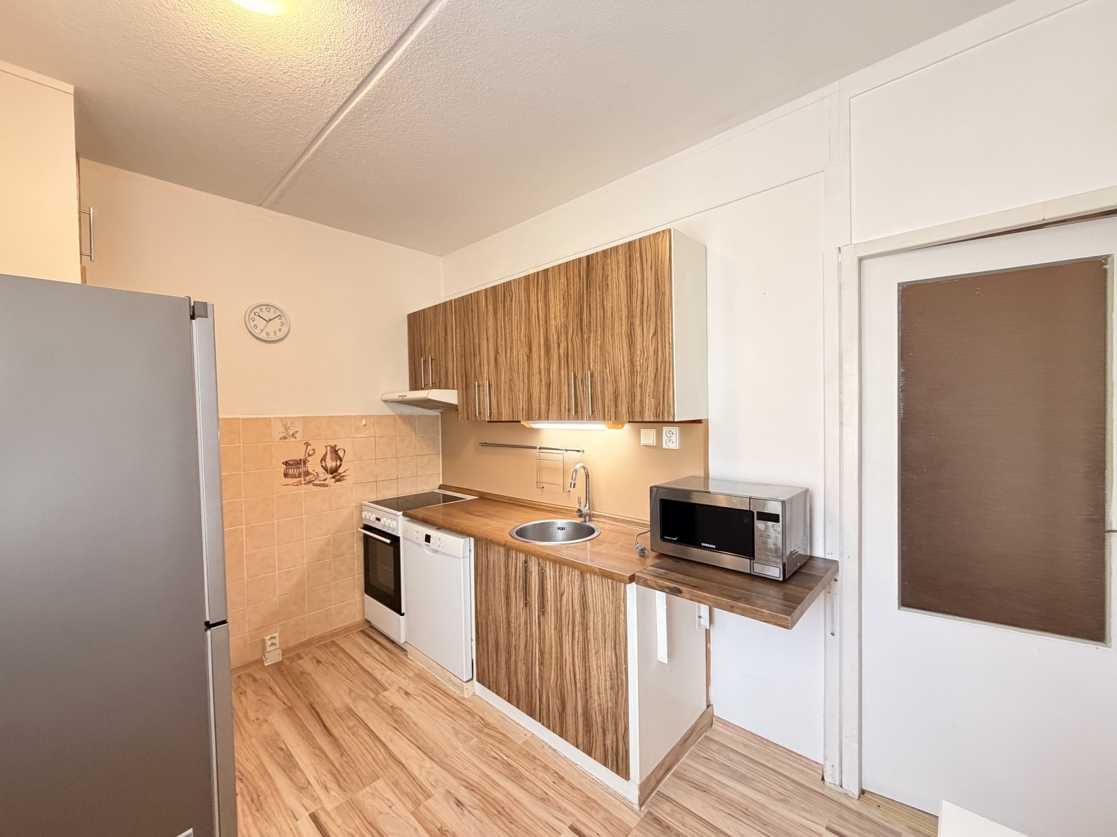 Byt se pronajímá s částečným vybavením, k dispozici je kuchyňská linka, lednice, nábytek v obývacím pokoji a dvě šatní skříně na chodbě, které zajišťují dostatek úložného prostoru.